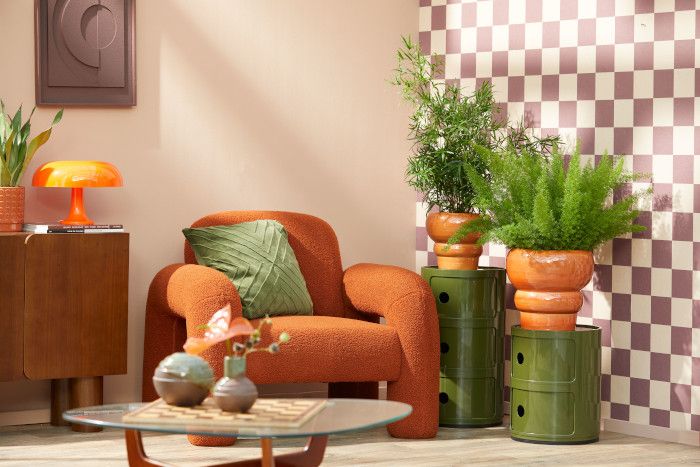 Die ikonische Ästhetik der 70er-Jahre erhält ein modernes Update. Zeitlose Designklassiker in Braun- und Orangetönen verbinden sich mit innovativen Materialien und floralen Elementen zu einem selbstbewussten, zeitgemäßen Look. Blüten- und Blatt-Exotik setzt markante Akzente und bringt einladende Wärme in den Raum.